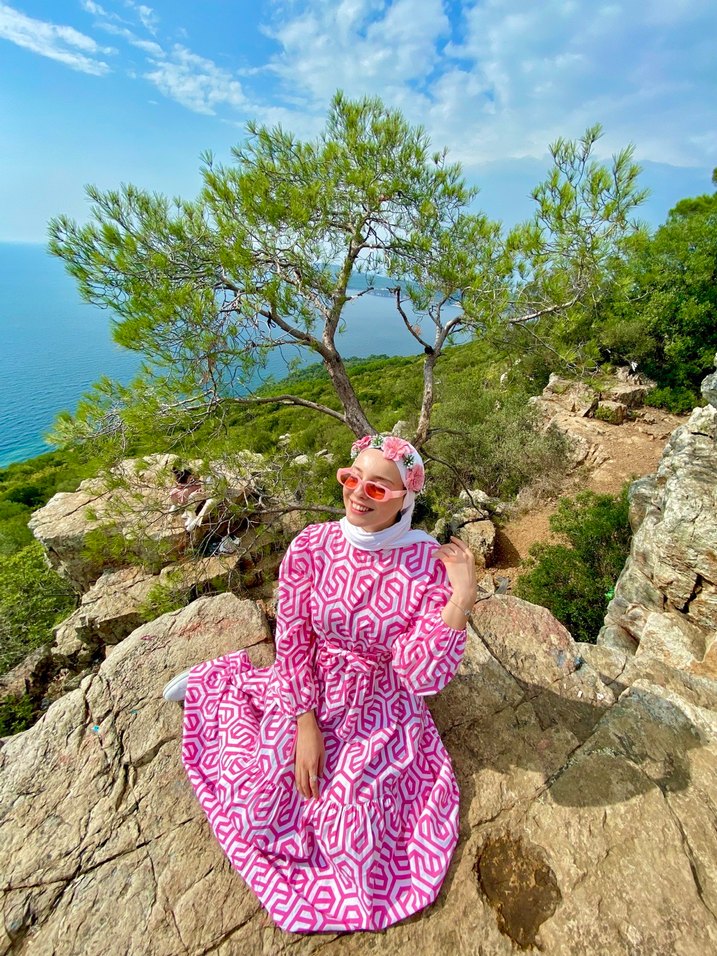 Renkli uzun elbise, yüksek yakalı ve askılı kollu, bol ve drapeli kesime sahip. Pembe batik deseni bohem tarzı yansıtıyor.
