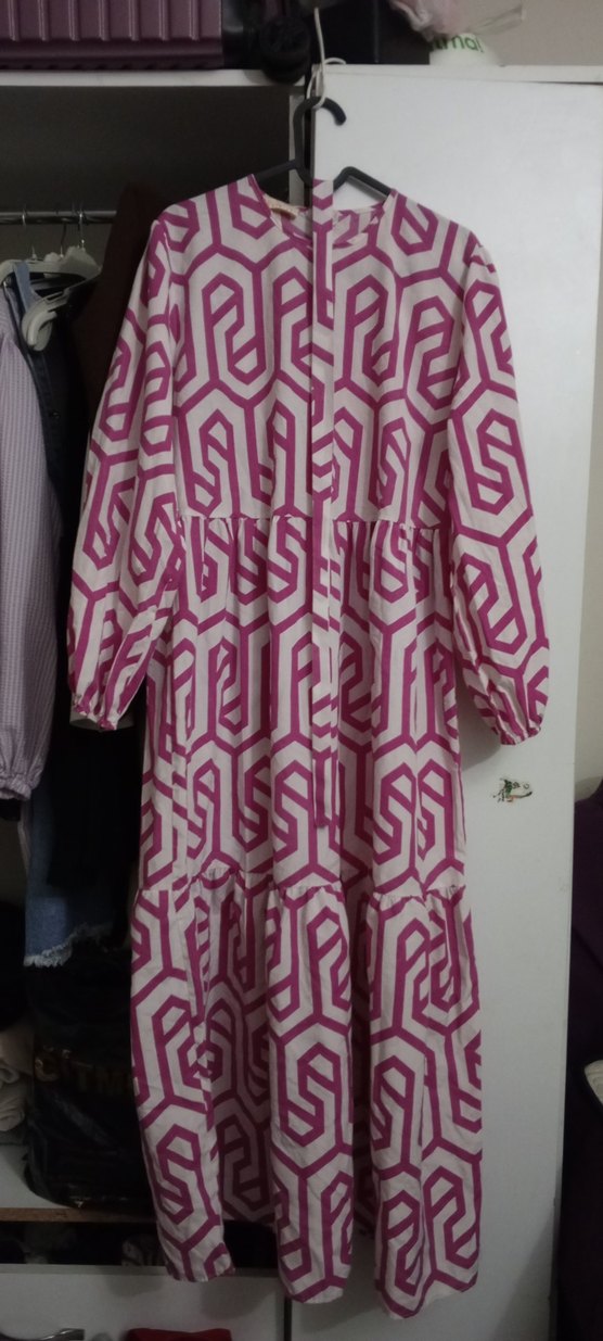 iade yoktur ❌ Pembe geometrik desenli, uzun ve bol kesim elbise. Volan detaylı, V yaka ve uzun kollu, bohem tarzda günlük kullanıma uygun.