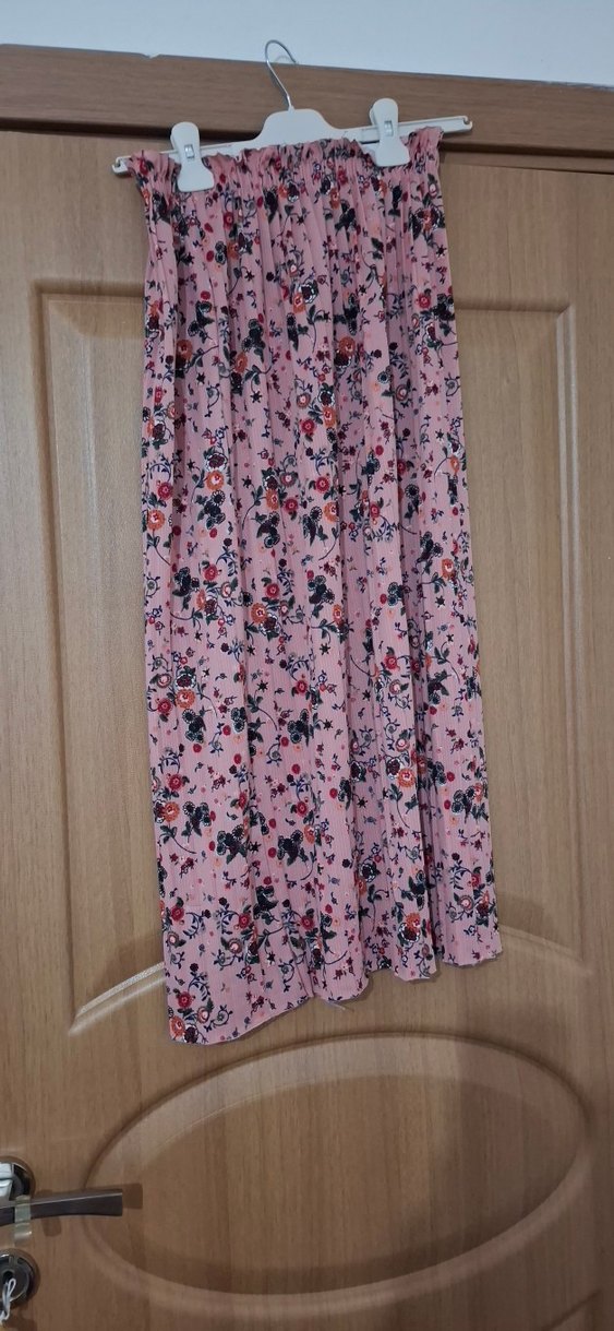 Pembe renkli, çiçek desenli, dökümlü detaylı uzun etek. Rahat kesimi ve yumuşak sentetik kumaşıyla bohem tarzını yansıtır. beli lastikli