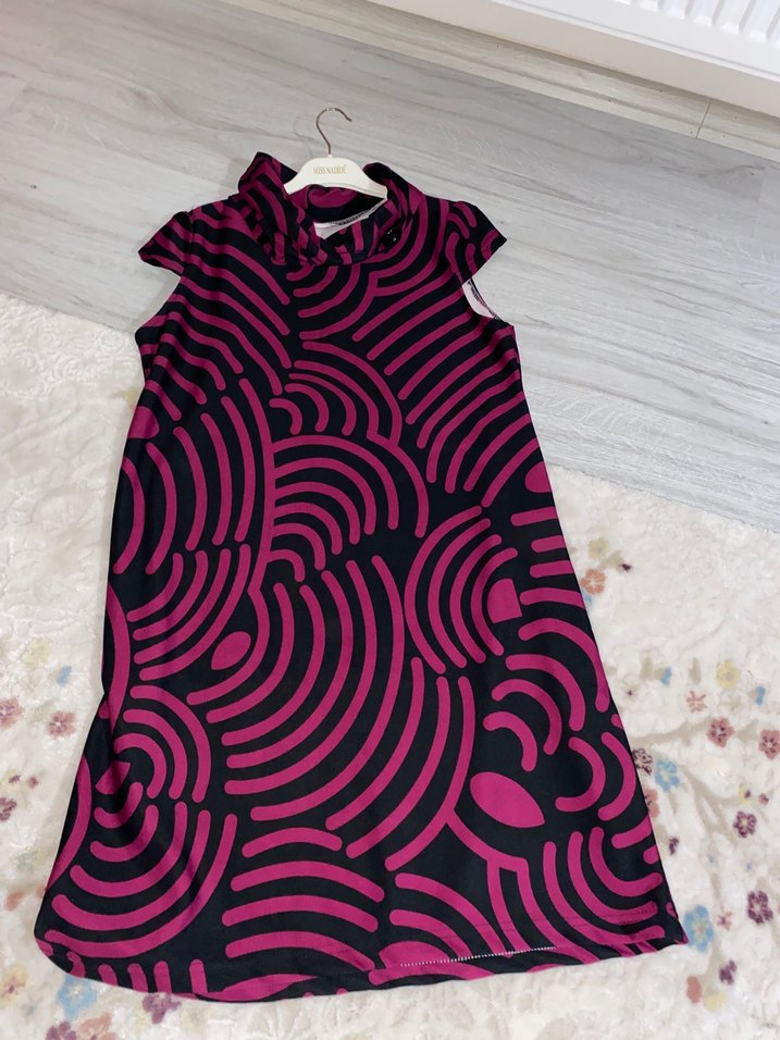 Kolsuz, yüksek yakalı ve vücuda oturan elbise Koyu pembe tie-dye desenli ve drapeli, çağdaş tarz için uygun.
