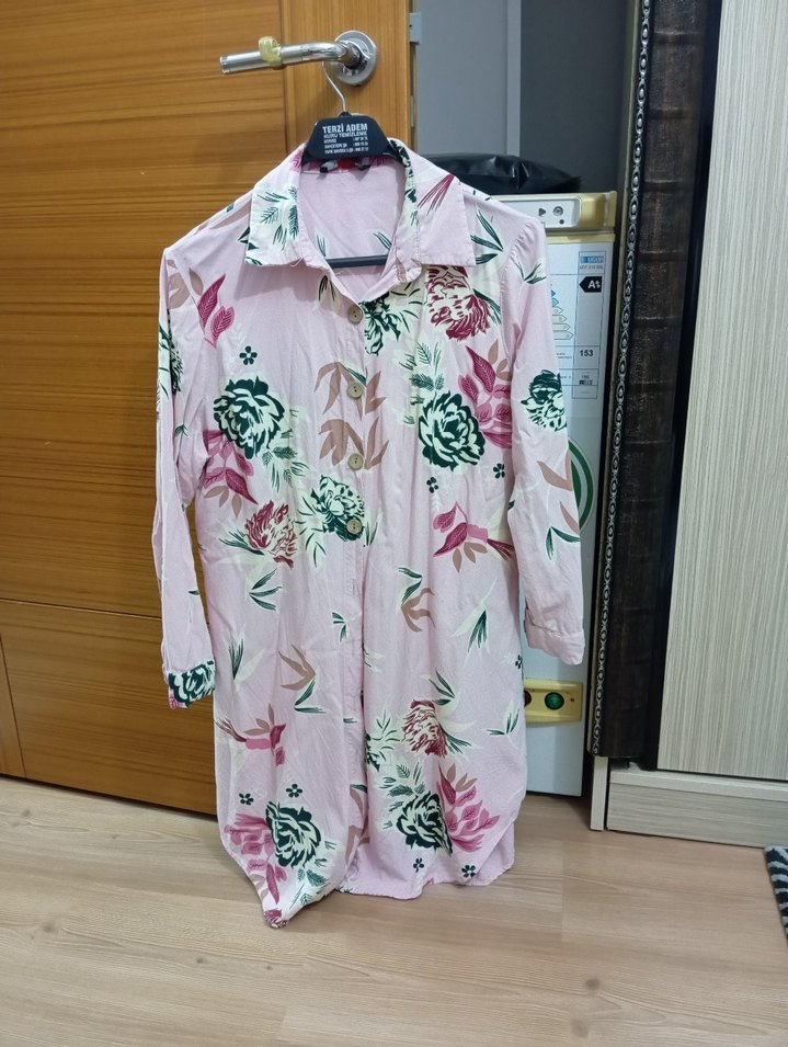 Pembe renkte, yakalı ve düğmeli, uzun kollu, bol kesim, pastel çiçek desenli, sentetik kumaştan günlük sokak stili gömlek.