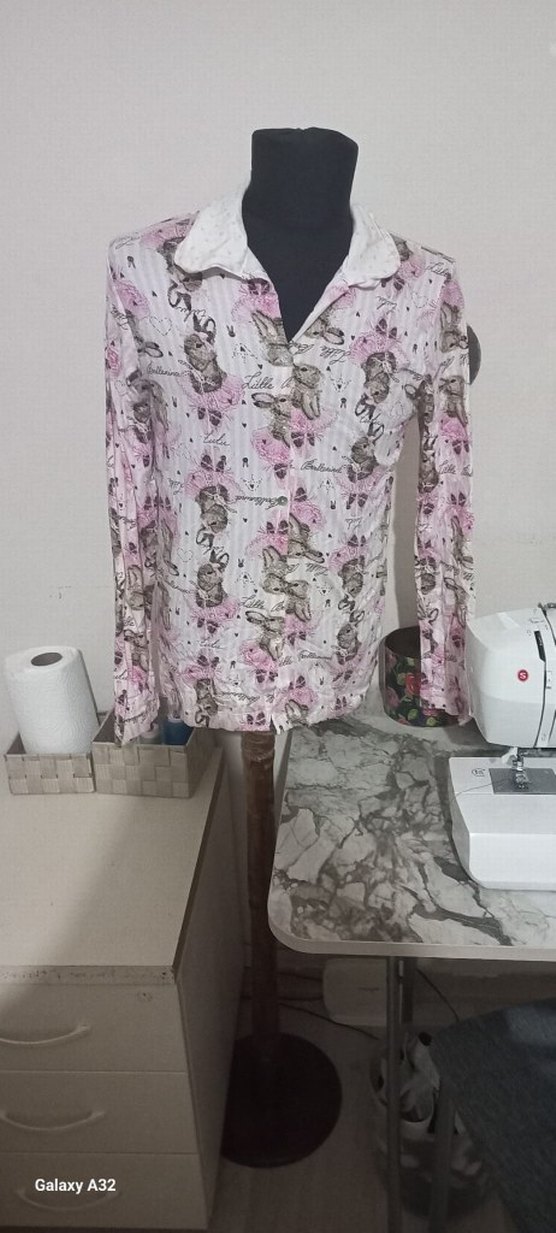 Pastel pembe desenli, uzun kollu, yakalı ve düğmeli, bol kesim kadın gömleği. Günlük kullanıma uygundur.