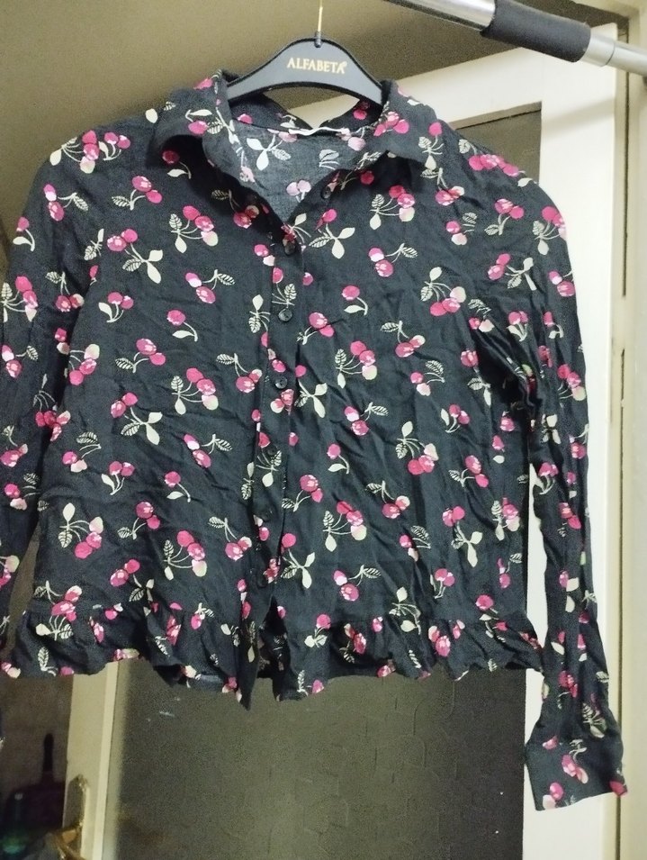 Düğmeli, uzun kollu, yakalı ve bol kesim pembe desenli kadın gömleği. Sentetik kumaştan, günlük sokak stiline uygun.