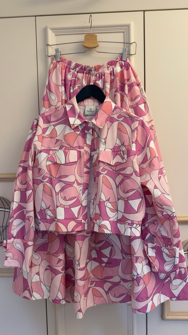 Pembe pastel tonlarda, desenli, uzun kollu, bol kesim kadın etek takım özel seridir 1-2 defa kullanıldı beden 38-40-42 benden için uygundur tertemizdir fiyatta yardımcı olurum