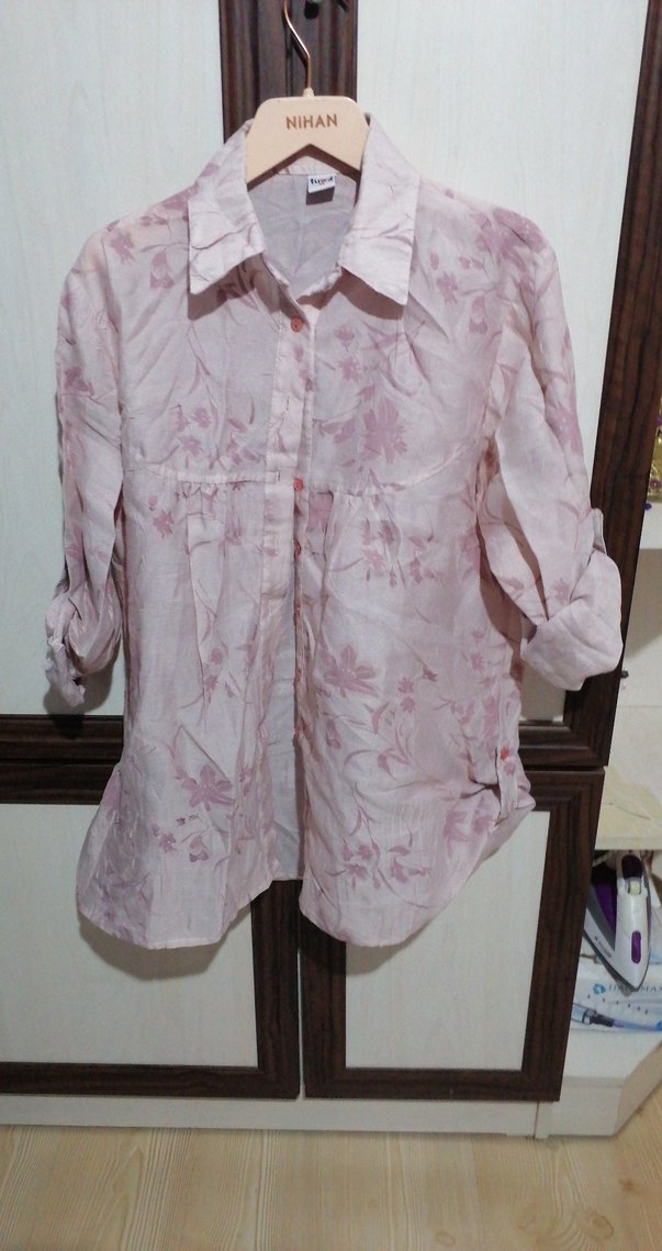 Pembe keten gömlek, uzun kollu ve düğmeli. Pastel tonlarda hafif çiçekli desenli, bol kesim ve yakalı, günlük kullanıma uygun. Hic geyilmedi kızıma aldım ama gedemedim evde kalmışetigeti yokdur yutdışına cıkacagım için gömrükde etigetli ürün olmazmış bende cıkardım hiç geyilmedi 38 40 arası