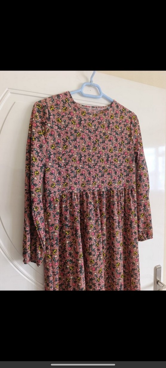 Bol kesim, uzun kollu tesettür elbise yuvarlak yaka ve fırfır detaylı. Pastel pembe desenli, yumuşak sentetik kumaştan, günlük kullanım için uygun.