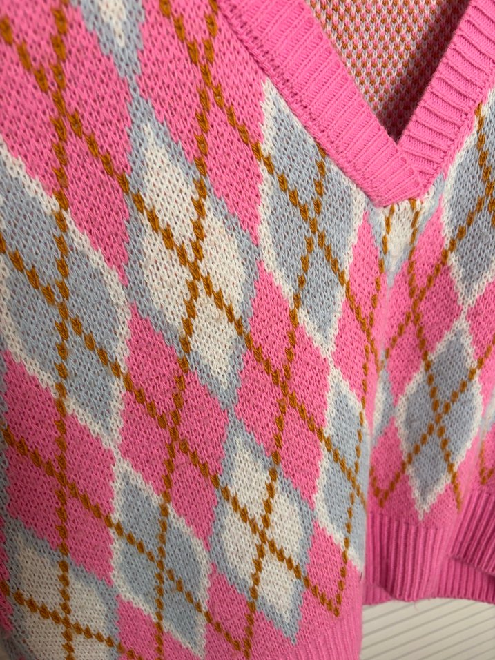 Pembe renkli, desenli ve V yaka örgü kadın süveter. Bol kesim ve ince askılı, bohem tarzına uygun rahat bir tasarım.