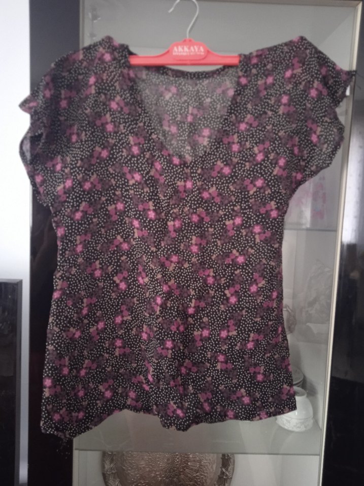 V yakalı, kısa kollu, pembe desenli kadın bluz. Rahat kesimli ve yumuşak sentetik kumaştan üretilmiştir. Günlük sokak stiline uygundur.