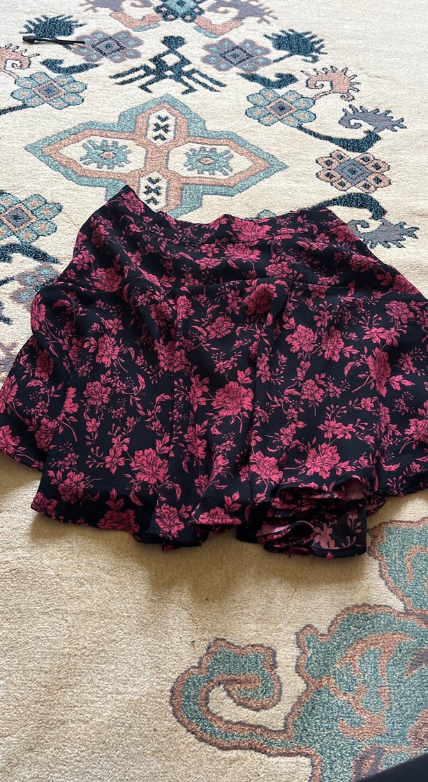Kısa, volanlı ve bol kesim mini etek. Koyu zemin üzerinde pembe çiçek desenleriyle bohem ve vintage goth tarzlarına uygundur.