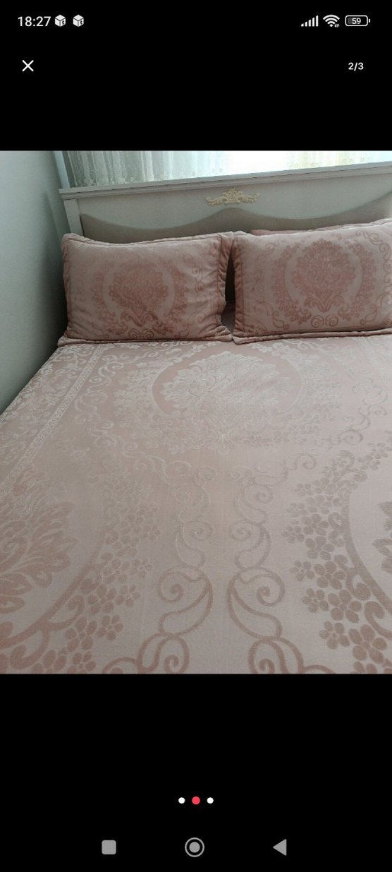 Pastel pembe renkli, zarif çiçek desenli yatak örtüsü ve uyumlu yastık kılıfları. Yumuşak dokusu ile rahat bir uyku ortamı sağlar. ️