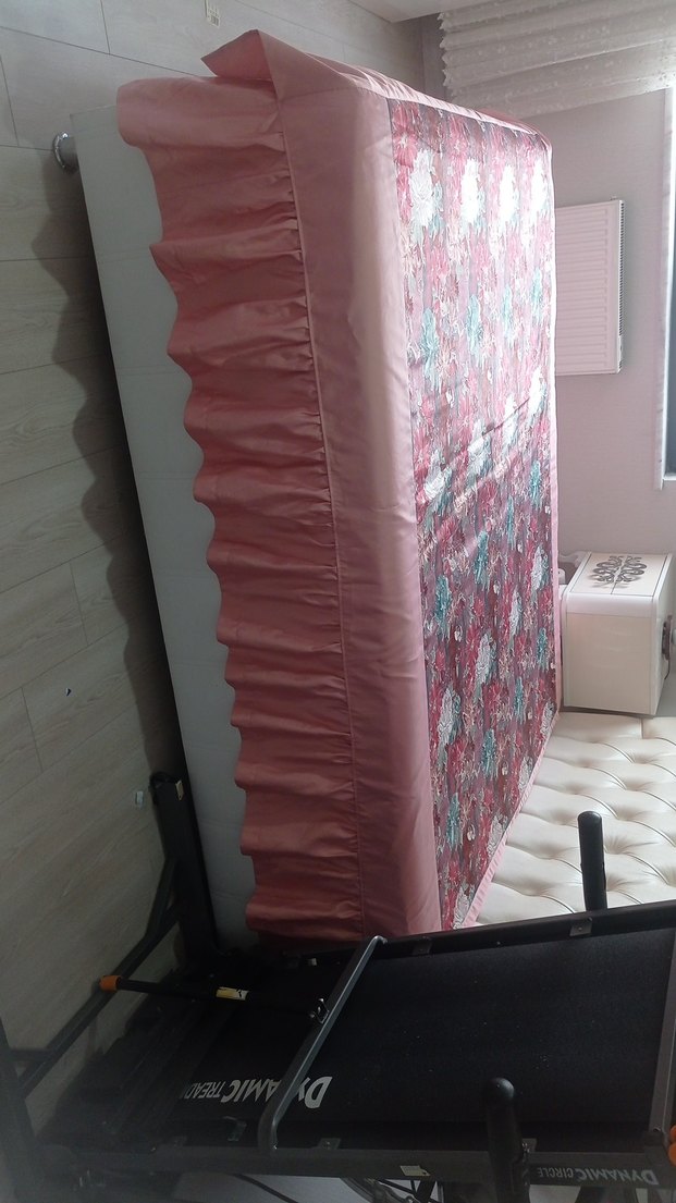 Pastel pembe renkte, desenli ve etek kısmı pileli yatak örtüsü.saten gibi kumaşı var