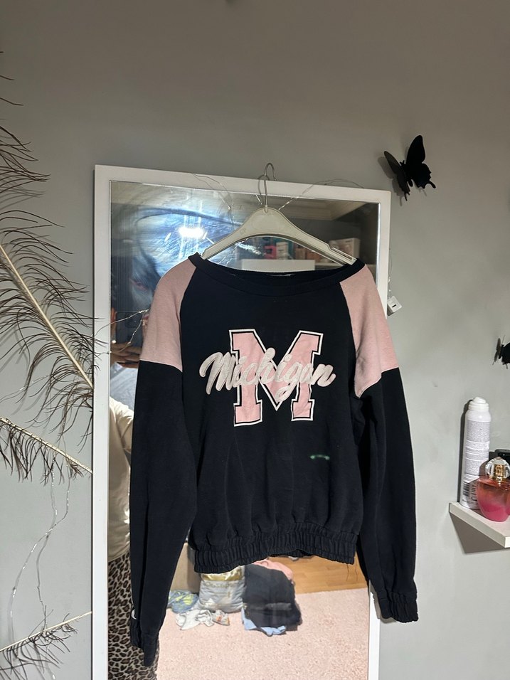 Uzun kollu, bisiklet yaka ve bol kesim olan bu kadın sweatshirtü, pembe örgü detaylar ve baskılı desenle günlük kullanıma uygundur.