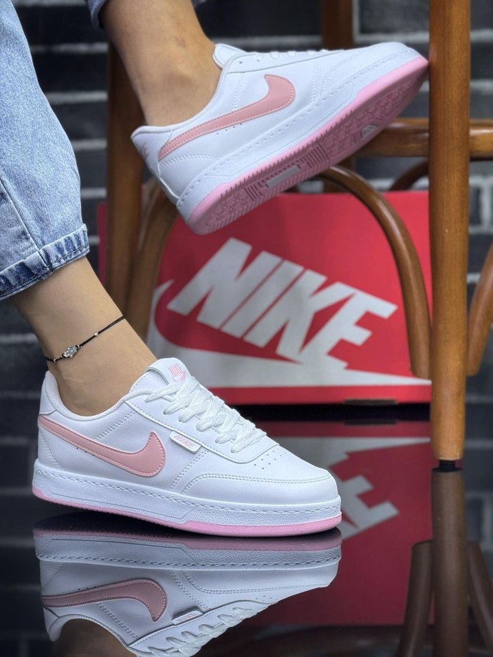Beyaz tabanlı, pembe detaylı Nike spor ayakkabı. Bağcıklı, ince topuklu ve kauçuk tabanlı, günlük kullanıma uygun. 36/37/38/39/40 ürünlerimizde değişim iyade yoktur