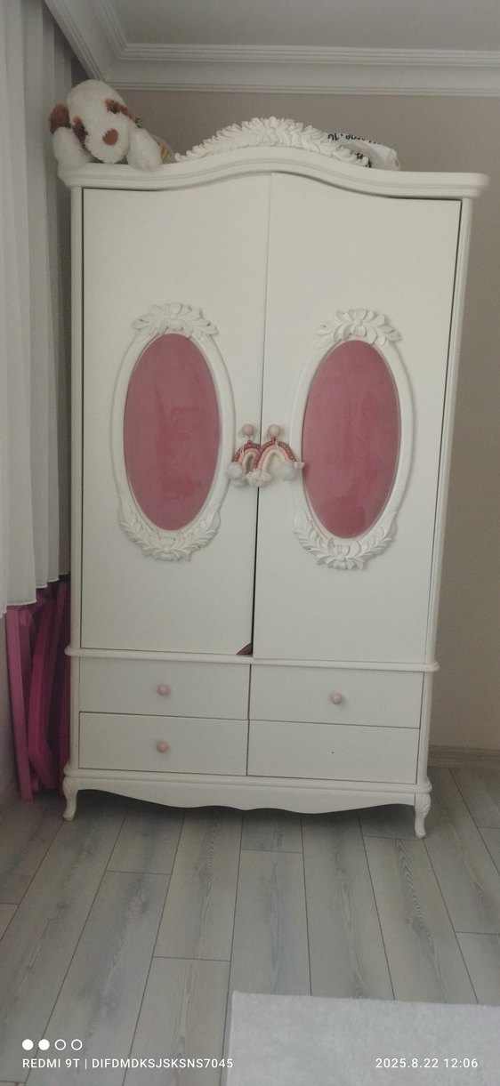 Pembe oval panelleri ve beyaz çerçevesi olan, dört çekmeceli çocuk gardropsu tertemiz herhangi bir sorun yoktur isteyene resim tekrardan atılır
