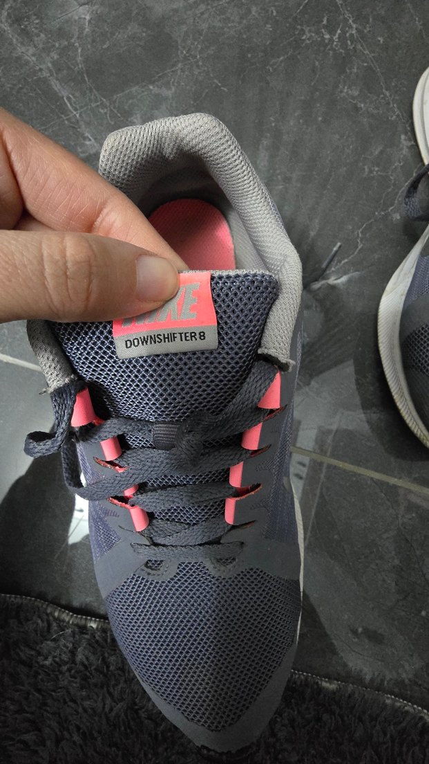 Gri kadın spor ayakkabısı, pembe baskılı detaylar ve cırt cırtlı özelliğe sahip. İnce topuklu, trend sokak stili için uygun. Etiketinde 'DOWNSHIFTER8' yazıyor. Hamileliğimde almıştım bir kaç ay giydim sonra ayağıma büyük geldi sağ tarafta burnunda hafif açılma var ama yapıştırma olur