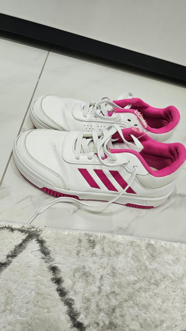 Renkli pembe ve beyaz detaylı, bağcıklı, kauçuk tabanlı kadın spor ayakkabısı, sokak stili için uygun. adidas 36.5 no göründüğü gibidir