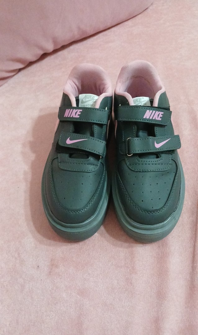 gri ve pembe renklerde, cırt cırtlı kiz çocuk spor ayakkabısı. Kauçuk tabanlı, Nike logosu bulunan renkli ve desen içermeyen tasarım.