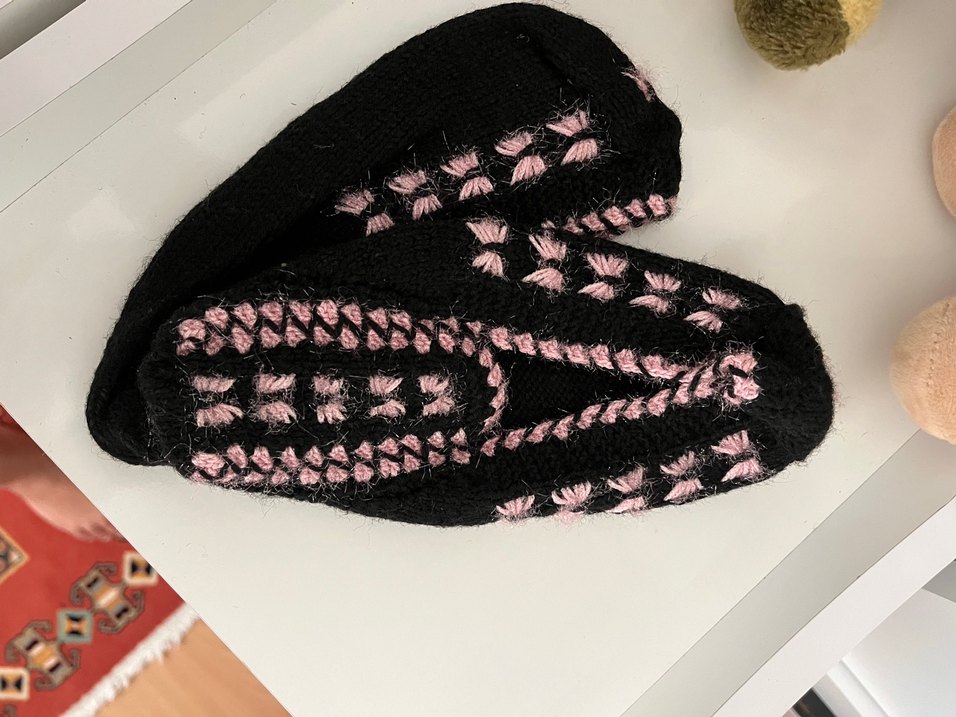 Siyah ve koyu pembe renklerde, yumuşak örgü kumaştan yapılmış kadın patiği . Bohem ve retro tarzıyla dikkat çeker.