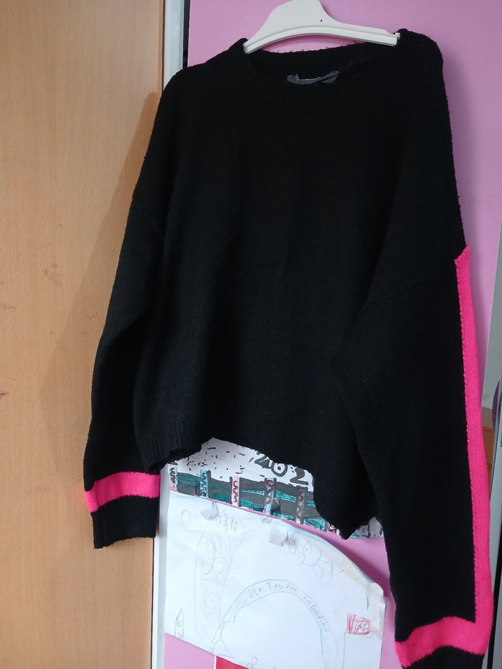 Bu kadın kazağı, uzun kollu ve yuvarlak yakalıdır. Rahat kesimi ve yumuşak, sıcak kumaştan örülmüş koyu pembe renkte, desensizdir ve günlük kullanım için uygundur.