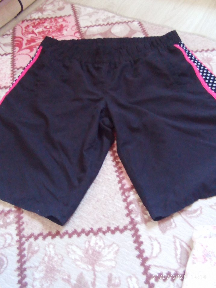 Esnek bel bantlı, bol kesim hamile şortu, koyu pembe ve desenli yan şeritlerle spor ve günlük sokak stiline uygun.