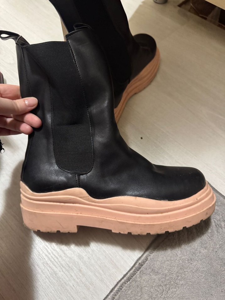 Siyah kauçuk kadın botları, platform topuklu ve kemer detaylıdır. Günlük kullanım için rahat ve trend sokak stili sunar.