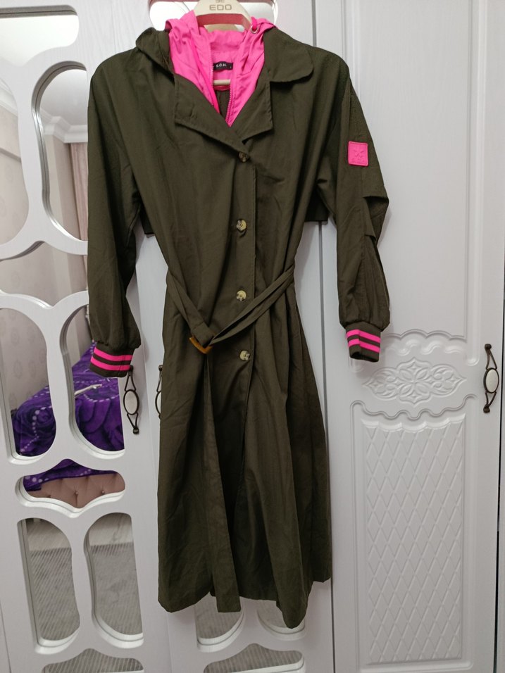 Uzun, kemerli, koyu renkli sentetik kumaştan kadın trençkot. Pembe detaylı yakası ve askılı kollarıyla sokak stiline uygun.