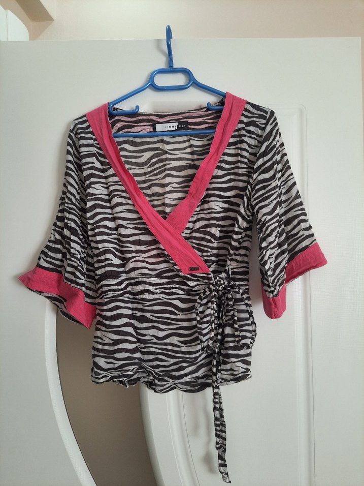 Zebra desenli, pembe detaylı, V yakalı, kuşaklı ve salaş kesim bluz. Rahat kumaştan. Hiçbir defosu yoktur. L bedendir. Jimmy Key marka.