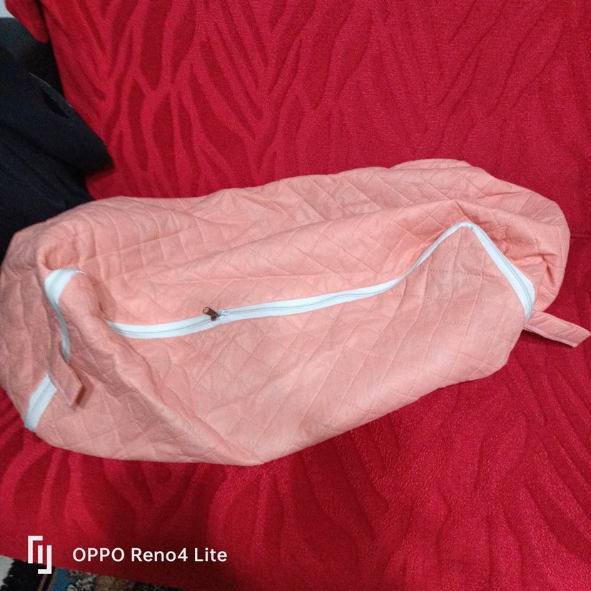 Pembe renkli, dikişli dokusu ve fermuar detayı olan yatak örtüsü. Desensiz ve renkli yapısıyla yatak hurcu