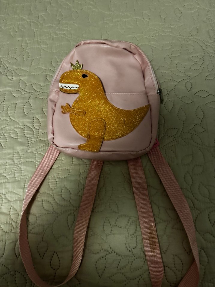Pastel pembe renkte, önünde simli dinozor figürü olan, ayarlanabilir askılı çocuk sırt çantası.