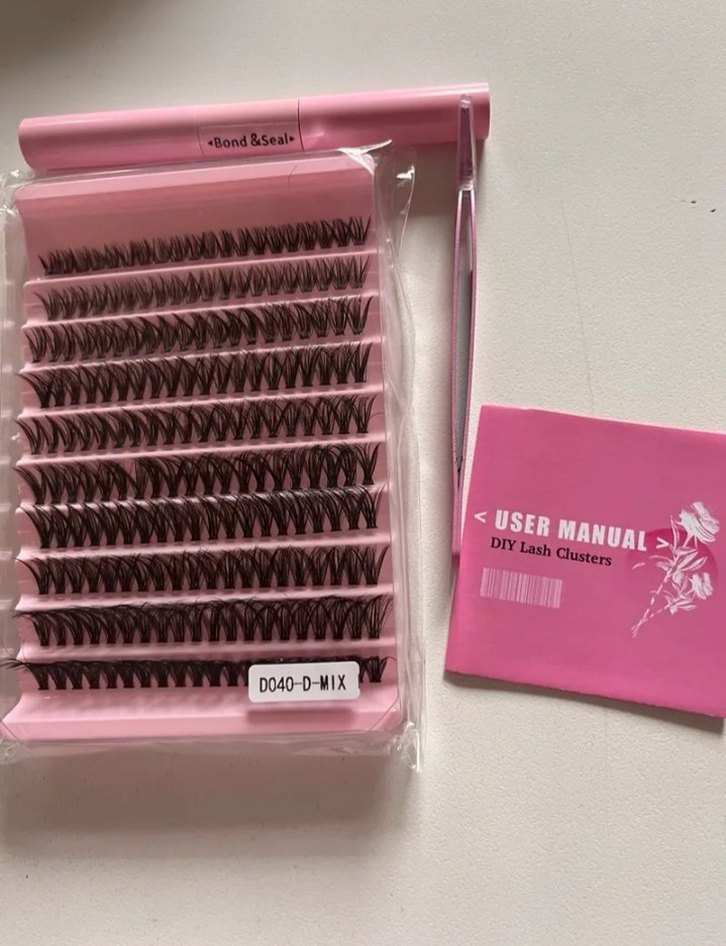 Kullanım kılavuzlu koyu pembe DIY kirpik kümeleri. Çoklu kirpik şeritleri ve uygulama aracı içerir.