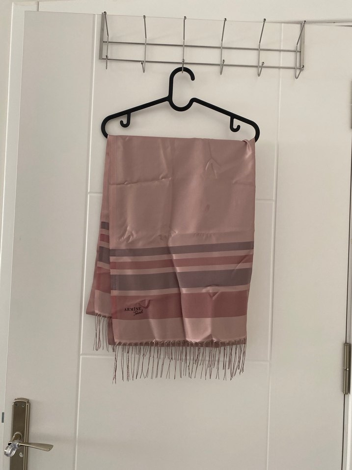 Pembe pastel tonlarında, ipek dokulu, dökümlü ve püsküllü şal. Paris sokak modasına uygun, rahat ve şık bir aksesuar.