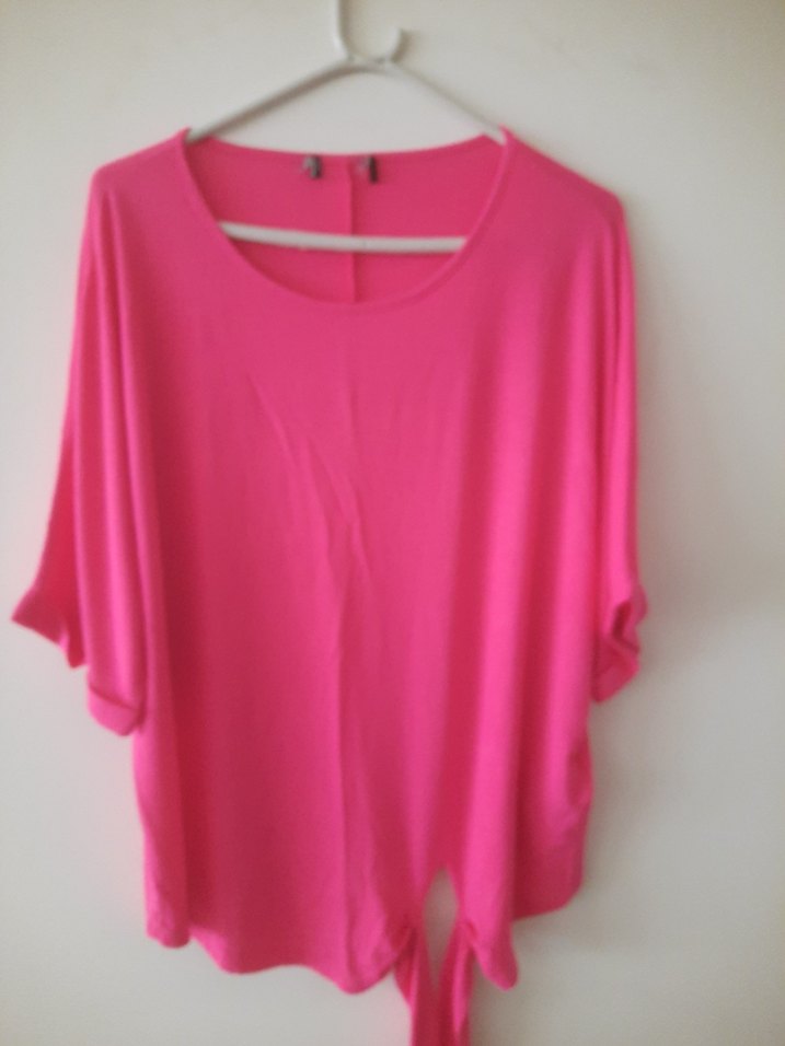 Pembe renkte, dökümlü tasarıma sahip, kısa kollu, yuvarlak yakalı, normal midi boyda kadın bluz. marka rasgele yazıldı. Butik ürünü.