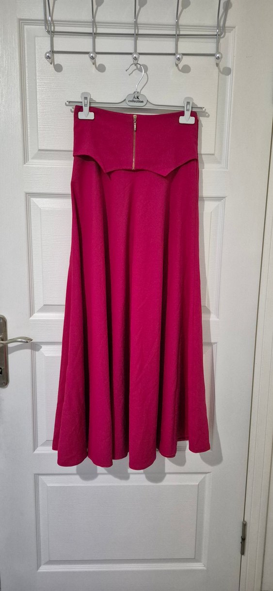 Pembe renkte, dökümlü ve bol kesim uzun etek. Bel kısmında görünür fermuar bulunur. Yumuşak ve sıcak kumaştan, romantik akşamlar için uygundur.