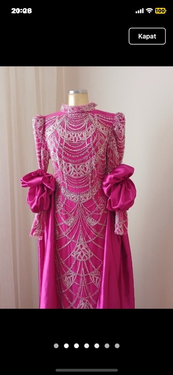 Pembe parlak uzun kollu, yüksek yakalı, dökümlü ve işlemeli desenli, klasik kesim kadın abiye elbise.