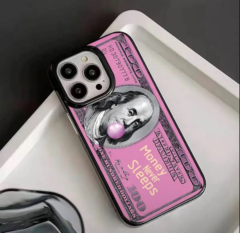 Pastel pembe renkte, kabartmalı ve karşı kültür tarzında, üzerinde "Money Never Sleeps" yazan 100 dolar temalı telefon kılıfı. İphone her model için mevcuttur