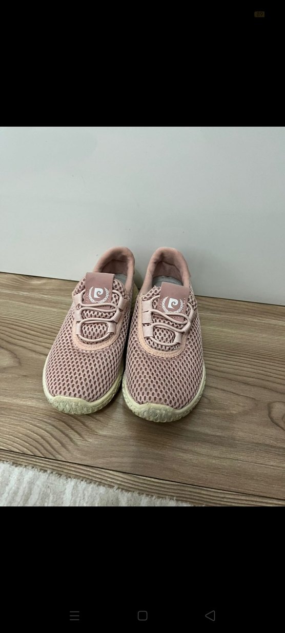 Pastel pembe renkte, dolgu topuklu ve bağcıklı kadın spor ayakkabısı. Nefes alabilen kumaş ve kauçuk taban ile günlük kullanım için uygundur.