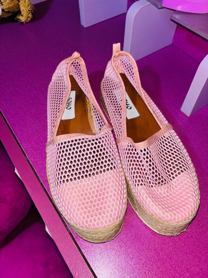 Pembe dolgu topuklu kadın espadriller, dantel detaylı ve nefes alabilir tasarıma sahiptir. Kauçuk tabanı dayanıklılık sağlar, günlük kullanım için uygundur.
