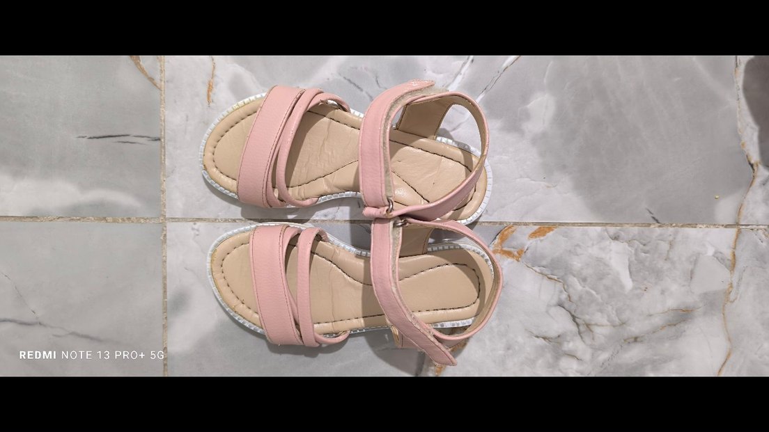 Pembe dolgu topuklu kadın sandaletler, tokalı kayışlara sahip ve lastikten üretilmiştir. Günlük kullanım için sade ve desensiz tasarıma sahiptir.