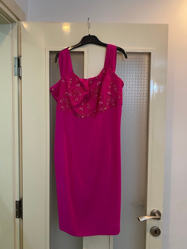 Pembe, drapeli detaylı, askısız ve kolsuz, vücuda oturan abiye elbise. Romantik akşamlar için uygun.
