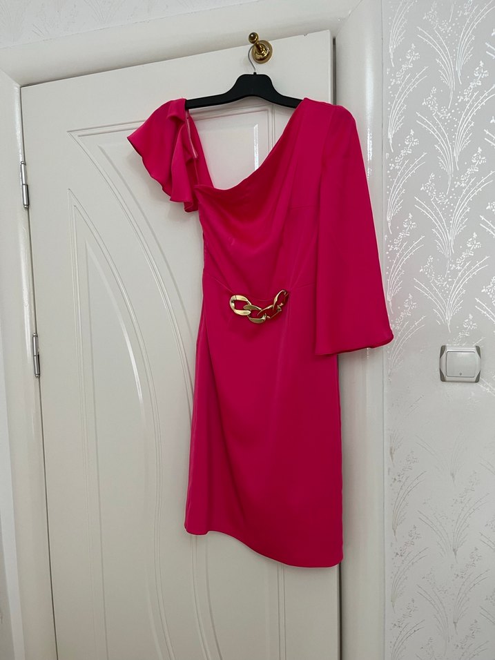 Pembe, drapeli ve parlak yüzeye sahip, straplez kısa ve dar kesim abiye elbise, romantik akşamlar için uygundur.