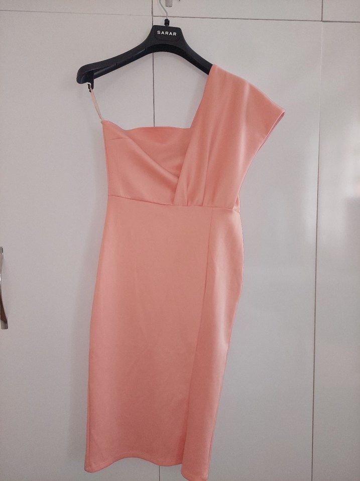 Tek omuzda drapeli detaylı, askısız, vücuda oturan kesim abiye elbise. Çağdaş tarzda, ofis için uygun.