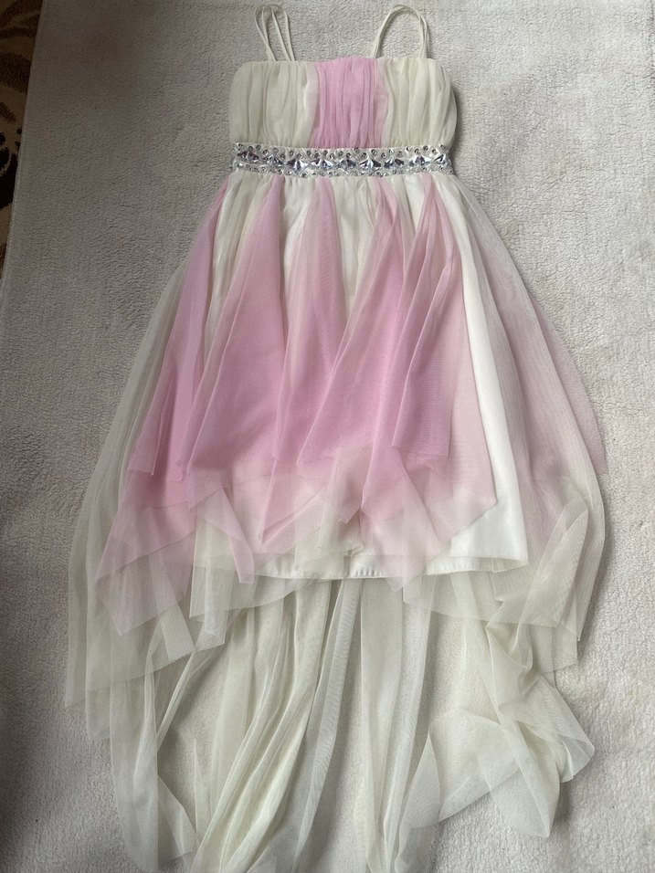 Askılı ve straplez yaka detaylı, fit kesim kız elbisesi. Pastel pembe beyaz tie-dye deseni, drapeli yüksek alçak etek ve taşlı bel detayı içerir. ✨marka temsilidir