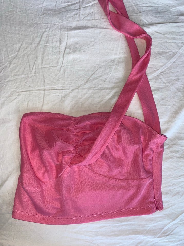 Pembe, drapeli ve askılı tasarıma sahip, parlak sentetik kumaştan yapılmış, normal boyda ve dar kesim midi bustiyer.