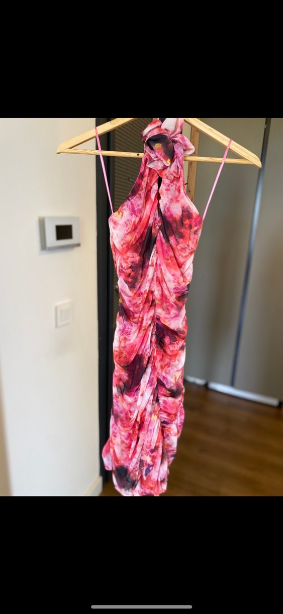 Drapeli ama M beden kadar olur çünkü esnek, boyundan bağlamalı elbise, halter yaka ve pembe koyu tonlarda desenli, romantik akşamlar için çok uygun. Tül ince kumaş içi astarlı iç göstermez çok hafif rahat bir kumaştır. Boyun kısmında çiçek detayı var. Ben altına siyah ince çorap giymiştim. Üzerine siyah blazerla kombinlemiştim kışın. Yaz kış giyilebilir. Kusursuzdur.