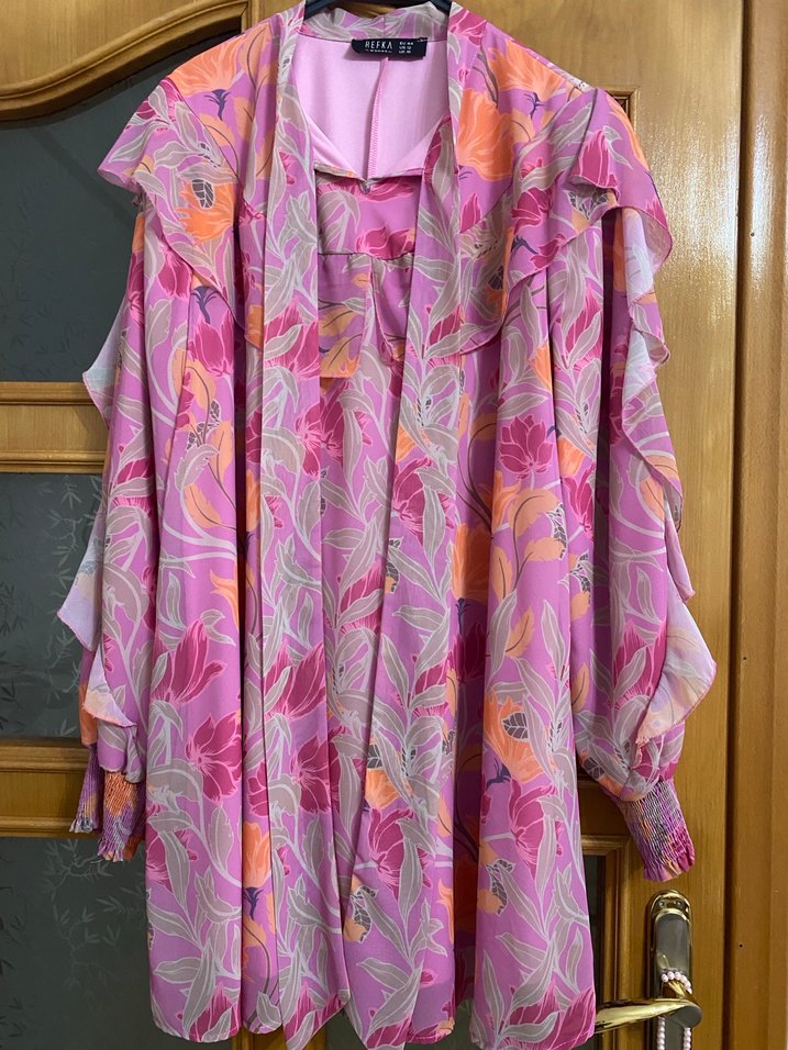 Pembe pastel tonlarda, bağlama desenli, bol kesim ve uzun boy Drapeli, ve uzun kollu, bohem tarzda. Sentetik kumaştan, günlük kullanım için uygun.