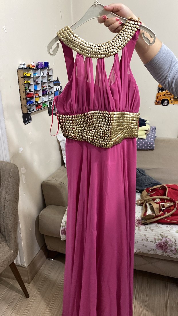 Pembe, drapeli ve uzun kesimli bu abiye elbise, halter yaka ve ince askılarla tasarlanmıştır. Bel kısmındaki parlak süslemeler bohem bir hava katar.