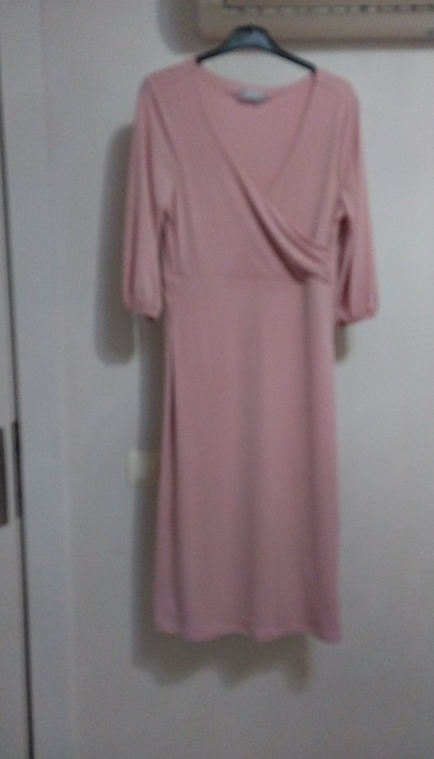 V yakalı, kısa kollu, drapeli pembe hamile elbisesi. Yumuşak sentetik kumaştan, klasik ve minimal tarzda, günlük kullanıma uygun.