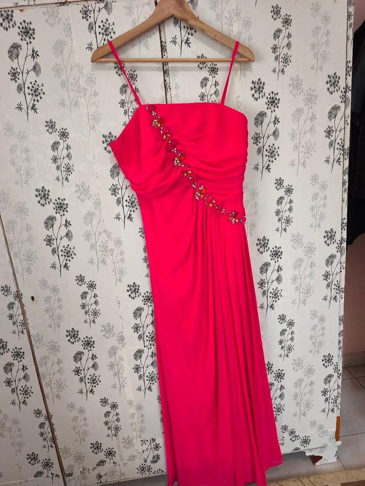 Drapeli ve ince askılı pembe uzun abiye elbise, ön kısmında renkli nakış detayları bulunur. Klasik zarafeti çağdaş stil ile birleştirir, düğünler için uygundur. Bir kere giyildi. defolari fotoğraflarda mevcut.
