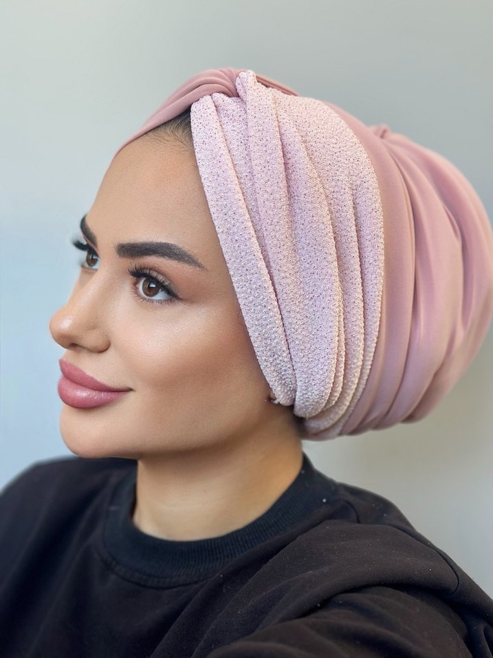 Pastel pembe renkte, yumuşak sentetik kumaştan drapeli tasarıma sahip kadın başörtüsüdür. Hem mütevazı hem de gösterişli sokak stili sunar.