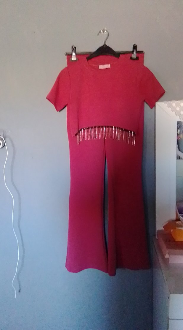 Bu pembe, parlak tekstil kumaştan, uzun ve drapeli, kısa kollu, fitted 2 li takım